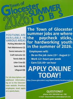 RECREATION DEPARTMENT SUMMER JOBS POSTED APRIL 27, 2026 The Town of Glocester, Rhode Island, is seeking candidates for various Recreation Department summer jobs.